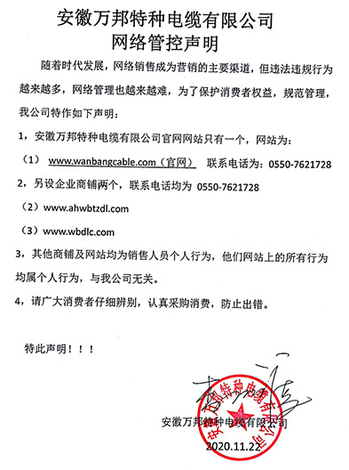 鄭重聲明:安徽萬邦特種電纜有限公司官方網站為:www_wanbangcable_com.caebbs.com,除此之外無任何子網站或合作網站,其余均為假冒偽劣。電話:0550-7621728 13485756353 地 址:安徽省天長市滁州高新技術產業開發區經四路29號